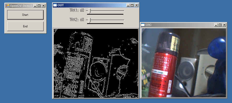 'ループ mIsRunning = True Do While mIsRunning 'キャプチャデバイスからイメージ取得 srcimg = cvQueryFrame(cap) '出力画像作成 cvCvtColor(srcimg, gryimg, CV_BGR2GRAY) 'カラーからグレーに変換 cvCanny(gryimg, outimg, mThreshold1, mThreshold2, 3) '輪郭線抽出 '描画 cvShowImage(SRCIMAGEWINDOW, srcimg) cvShowImage(OUTIMAGEWINDOW, outimg) Application.DoEvents() Loop |