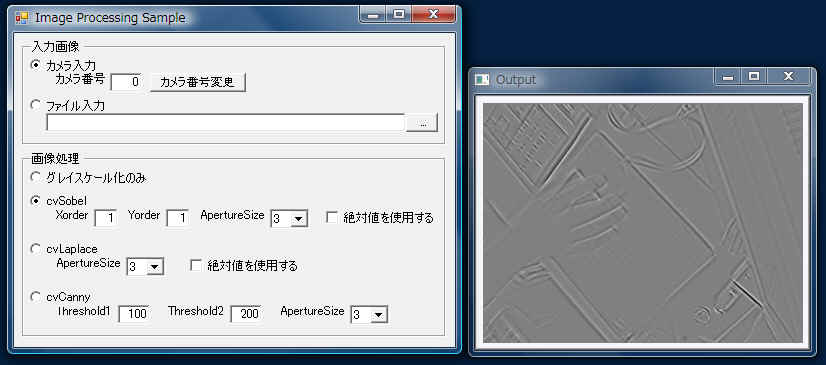 cvSobel、cvLaplace、cvCannyでのイメージ処理のサンプルです。