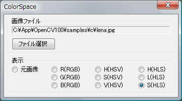 静止画ファイルを読み込み、RGB/HSV/HLSの各プレーンを表示するサンプルです。