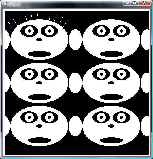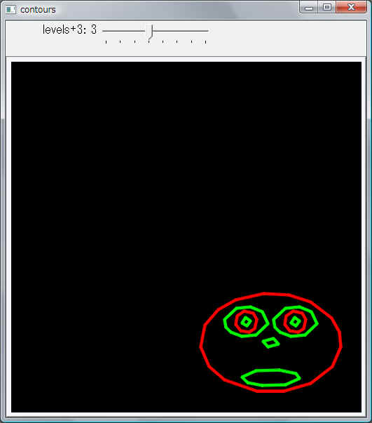 画面に複数の顔を描いて、cvFindContoursにて輪郭線を抽出するサンプルです。